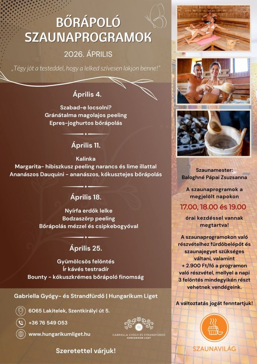 2026. áprilisi bőrápoló szaunaprogramok
