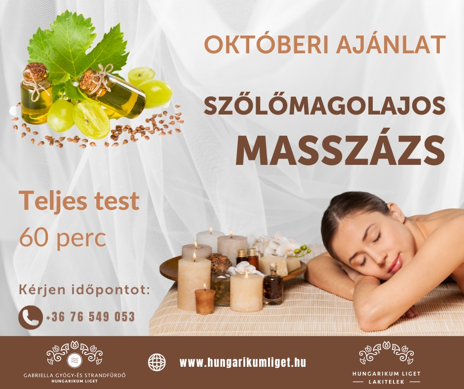 Próbálja ki 60 perces szőlőmagolajos masszázsunkat a lakiteleki Hungarikum Liget - Ligetszépe Gyógyászaton, ahol nem csak a víz gyógyít!