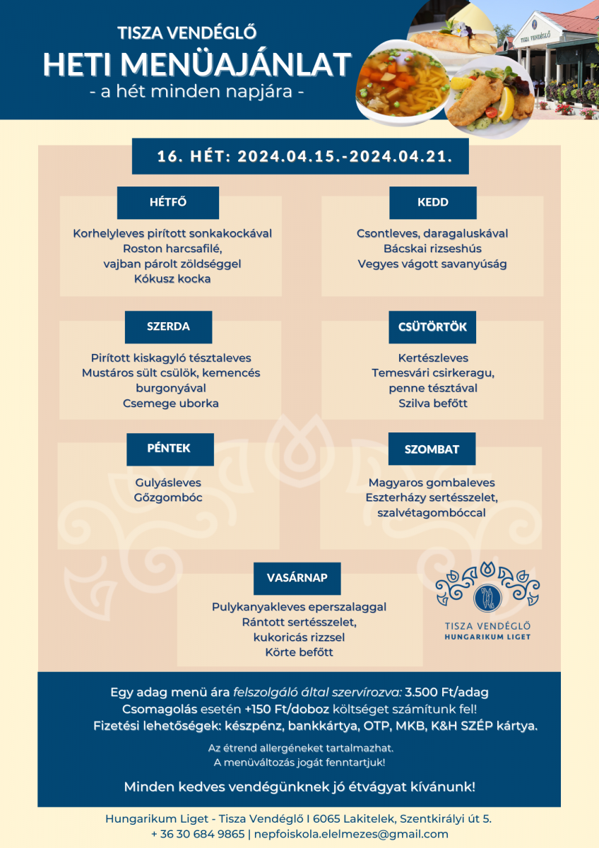 Tisza Vendéglő heti menü ajánlata 2024.04.15.-2024.04.21.