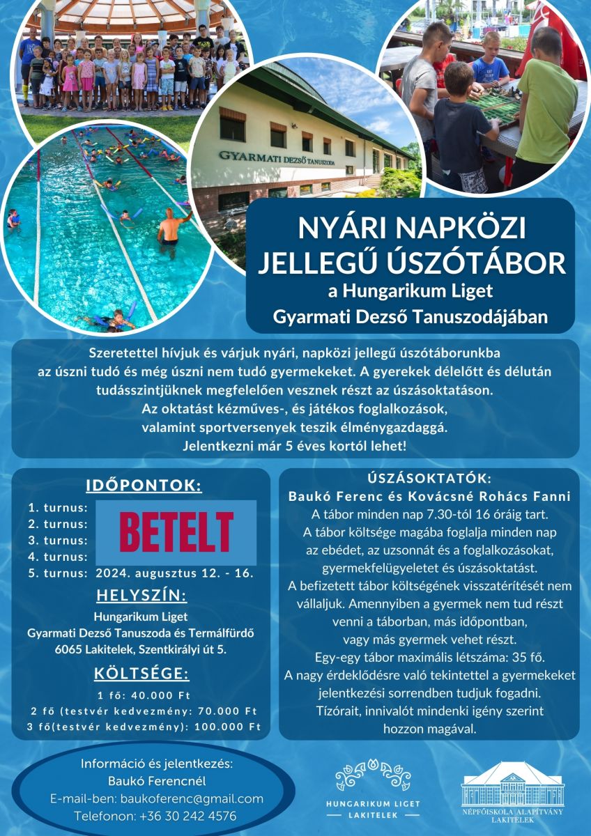 Szeretettel hívunk minden úszni tudó és még úszni nem tudó gyermeket nyári napközis jellegű úszótáborunkba! Már csak az ötödik turnusban maradtak szabad helyek!