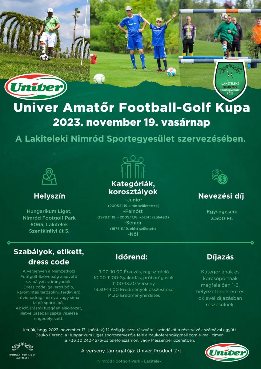 Univer Amatőr Football-Golf Kupa kerül megrendezésre 2023. november 19-én a Lakiteleki Nimród Sportegyesület szervezésében a lakiteleki Hungarikum Ligetben.